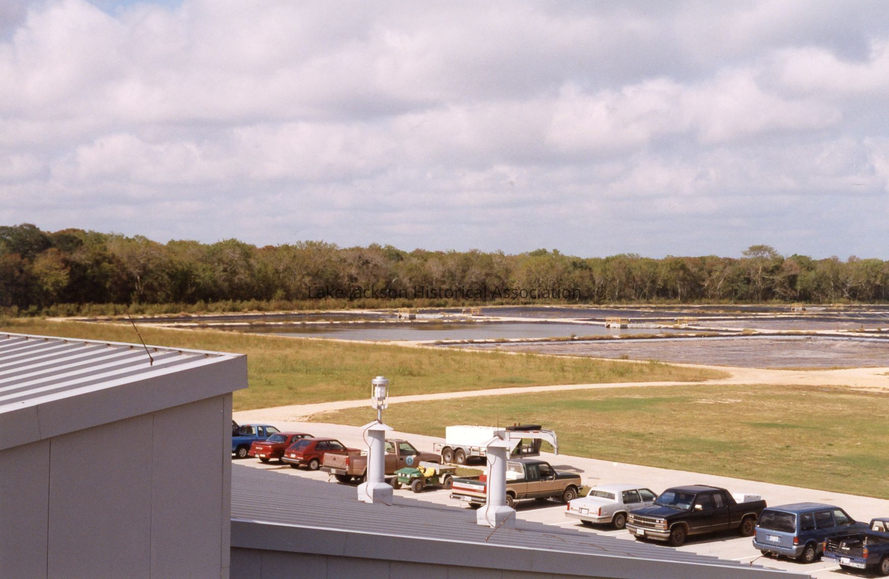 color photograph of parking lot with ten cars/trucks; rectangular ponds in backgroundCollection