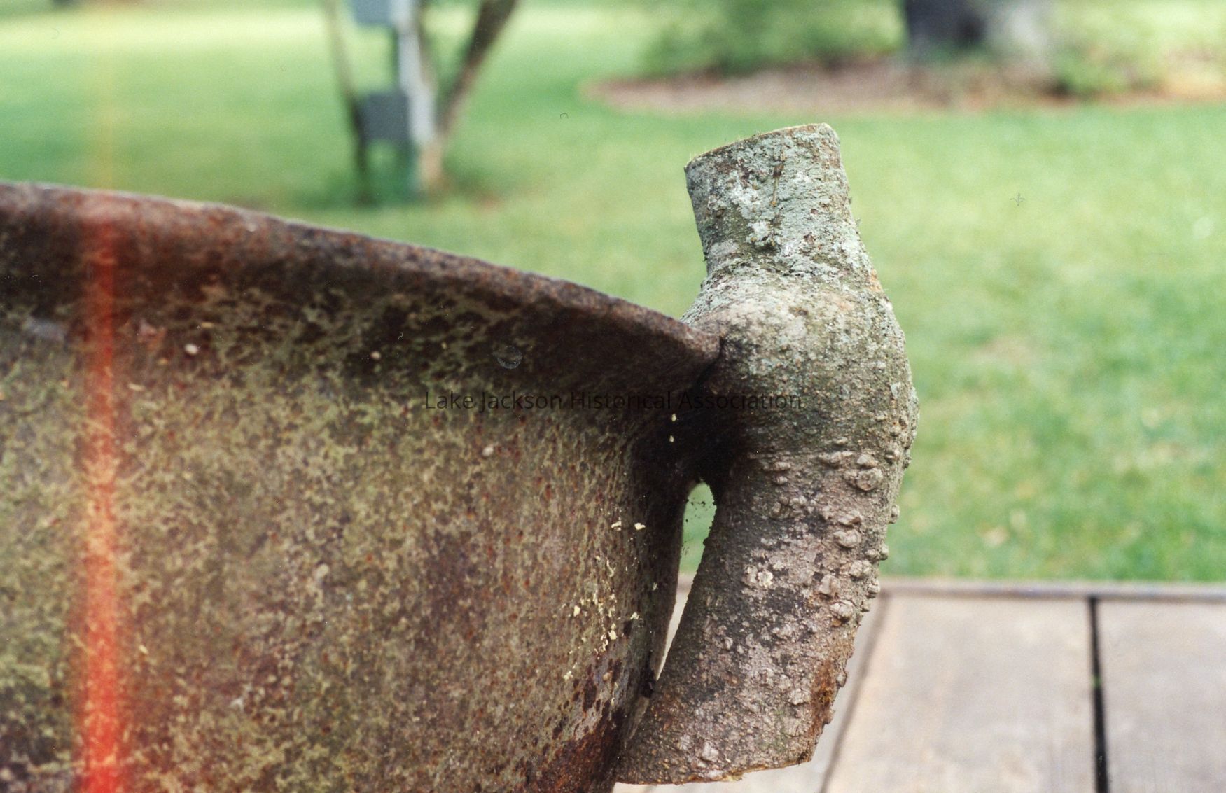 photograph of a side of portion of a sugar bowl, with trees and grass in the background, that has a cut off piece of tree that became attached and curled to the sugar bowl after growing so close to it over time.Collection