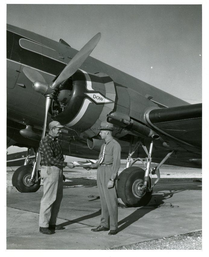 Two men standing in front of DC-3 aircraft. Dow logo on left engine of aircraft. Publicity photo. Possible purchase of aircraft. Man on left handing papers to man on right.