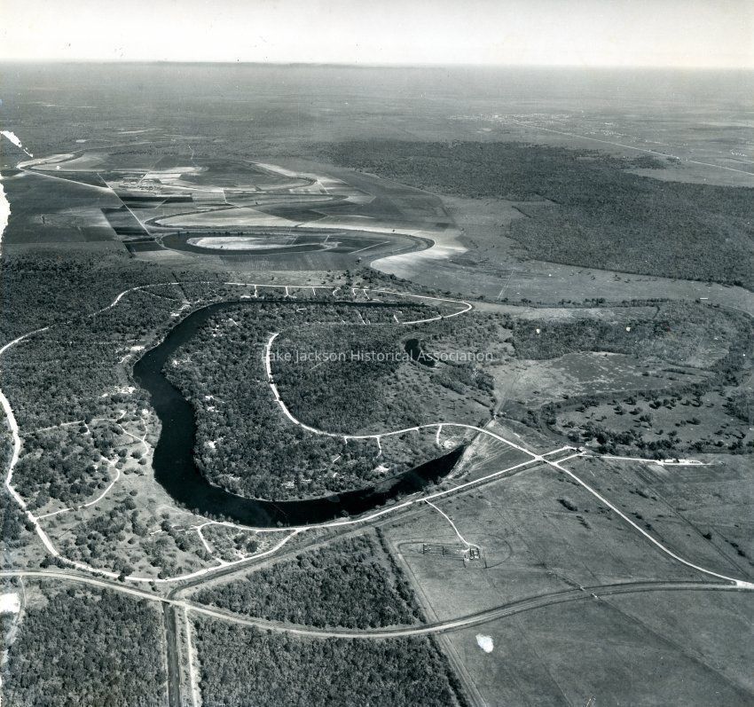 Aerial photograph of Lake Jackson from 1952 facing North. Shows Lake Jackson. Shows Lake Road and Bayou Road and present day HWY 332 and FM 2004.