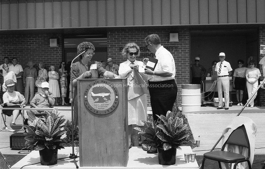 Black and white negatives with various photographs of people taken during the donation of the Windecker Eagle (N4195G) to the Lake Jackson Historical Association held at the Brazoria County Airport.Collection