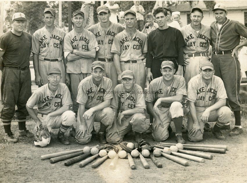 Black and White photo Lake Jackson Jaycees softball team. Front row: Left to Right: R. Cherry, Hershel Orr, Rusty Koenig, Dub Holt, and Manager W. McGill. Back row: Left to Right: George (Red) Manross, Spike McGuire, T.R. (Soapy) Lee, Mirl Howard, Sam King, Gene Gaull, L.E. (Cotton) Meneken, J.W. (Speedy) Bullard.Collection