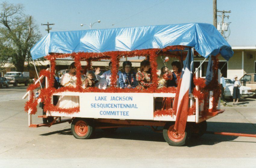 Color - Lake Jackson Historical Celebration for the sesquicentennial of Texas. Lake Jackson Sesquicentennial Committee ride in the city trolly in parade.Collection