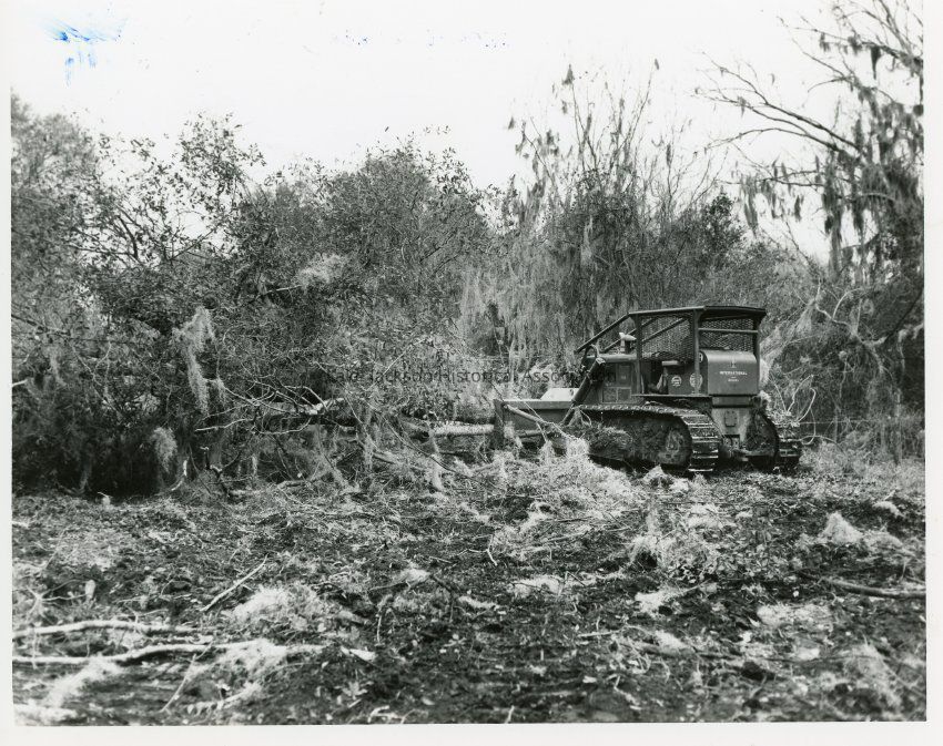 Black and White print - Lake Jackson town construction. Bulldozer clearing away trees and brush.Collection