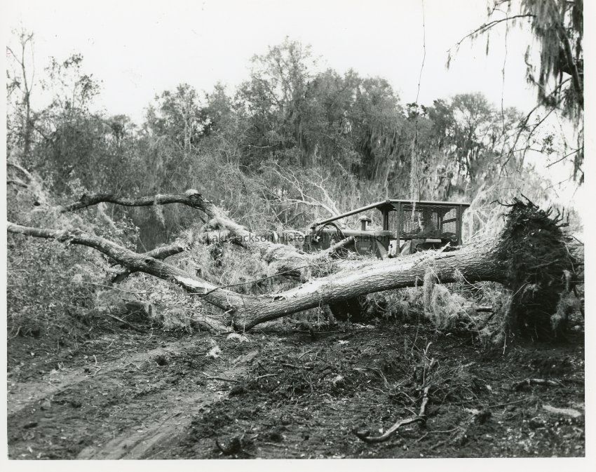 Black and White print - Lake Jackson town construction. Bulldozer clearing brush and tress.Collection
