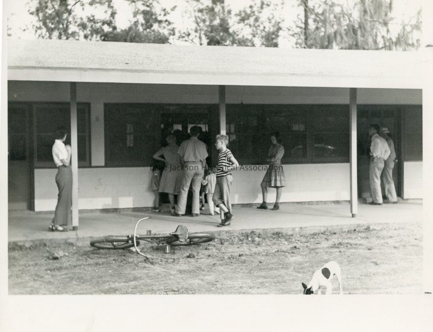Black and White print - Lake Jackson town construction. Post office line South Parking Place. Waiting for mail call. Somebody would pck up mail at camp chemical and bring to Lake Jackson.Collection
