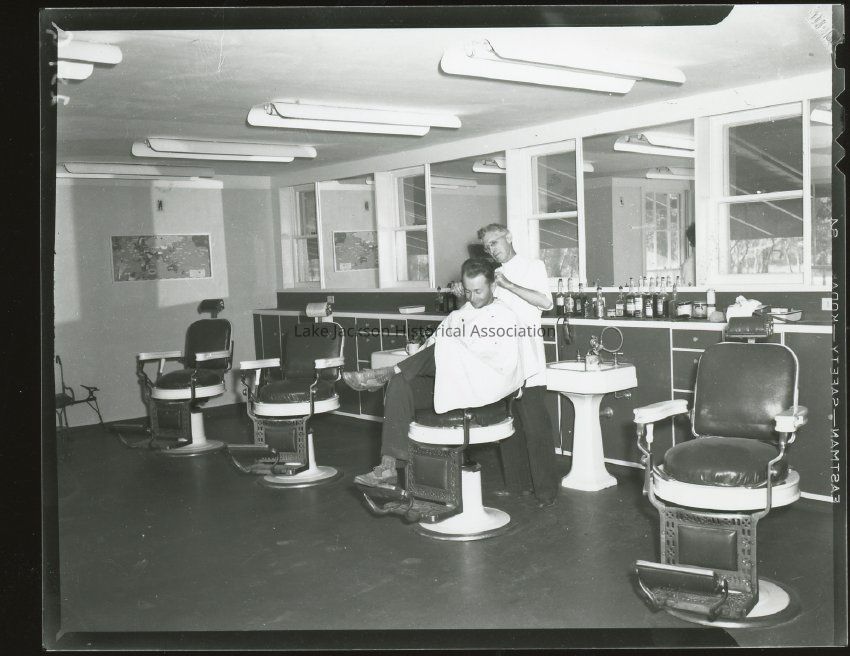 Tom Vaughan barber shop. Giving a hair cut to Frank J. Steves.Collection