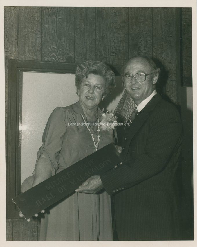 Black and White print - Mildred Tate. Instrumental in the formation of the Brazosport Museum of Natural Science. Was curator of the museum with the Mildred Tate Hall of Malacology named for her. Picture of Mrs. Tate and Jim Nabors at dedication of museum Hall of Malacoloy.Collection