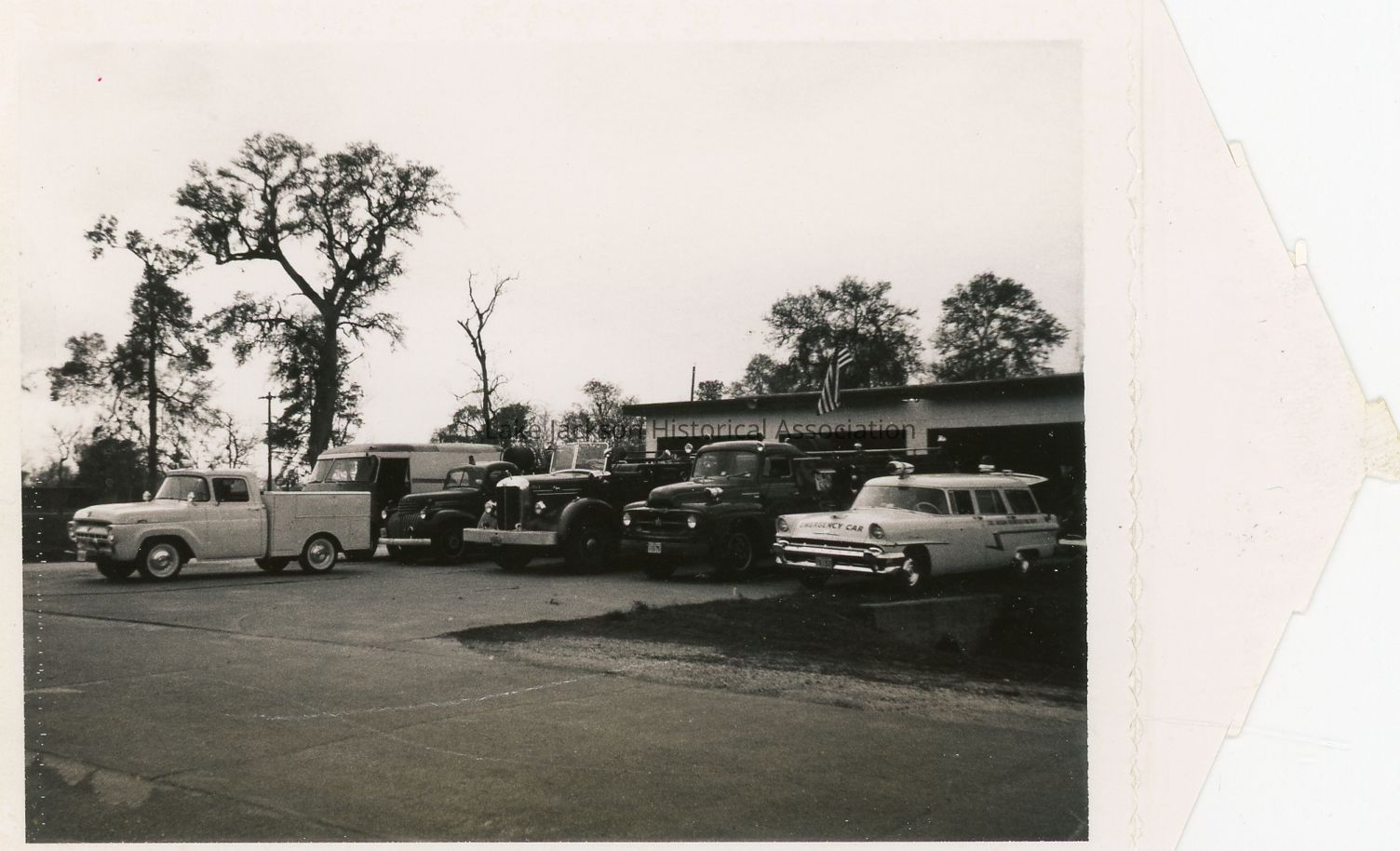 Black and White print. Lake Jackson fire house and emergency vehicles.Collection