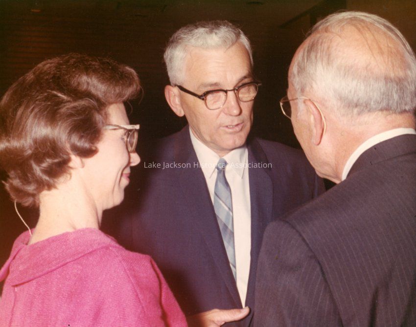 Nelson Griswold (facing away from camera) talking with unknown man and woman at his retirement party held in the Dow Plant B Cafeteria on May 13, 1966.Collection