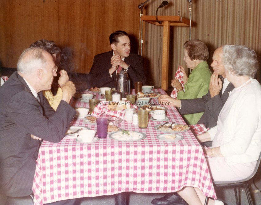 Group of people having dinner at Nelson Griswold's retirement party on May 13, 1966 at the Dow Plant B Cafeteria in Freeport, Texas. Left: Nelson Griswold. Head of table: Earl Barnes. Right: Mrs. Griswold.Collection