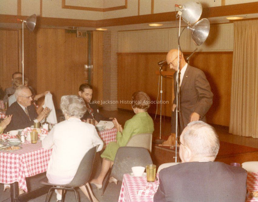 Group of people at Nelson Griswold's retirement party on May 13, 1966 at the Dow Plant B Cafeteria in Freeport, Texas. Left: Nelson Griswold, Mrs. Griswold, Earl Barnes. Others are unknown.Collection