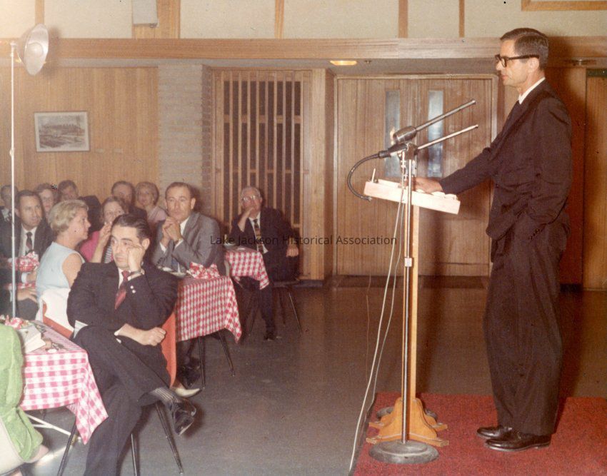 Unidentified man speaking to group of people at Nelson Griswold's retirement party on May 13, 1966 at the Dow Plant B Cafeteria in Freeport, Texas. Seated man in front is Earl Barnes.Collection