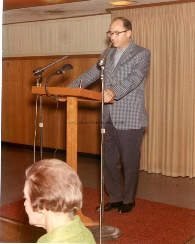 James (Jim) Nabors at microphone at Nelson Griswold's retirement party on May 13, 1966 at the Dow Plant B Cafeteria in Freeport, Texas. Identified from note attached to back of photograph.Collection