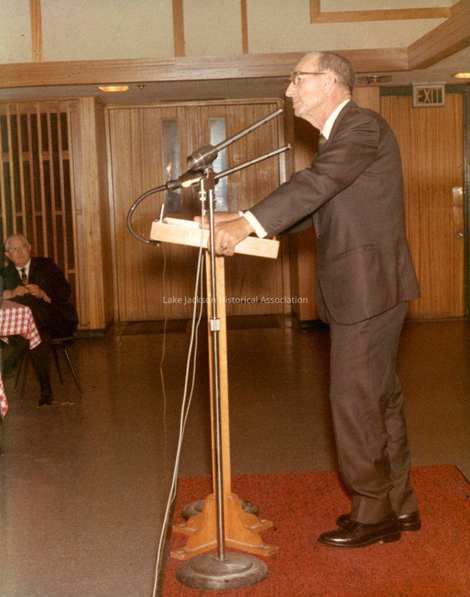 Unidentified man at microphone at Nelson Griswold's retirement party on May 13, 1966 at the Dow Plant B Cafeteria in Freeport, Texas.Collection