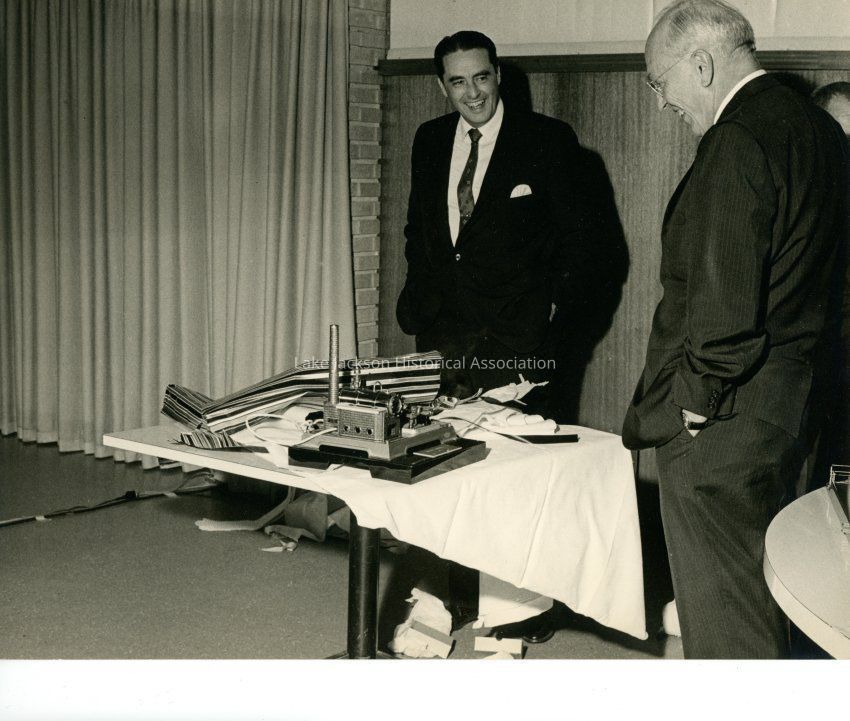 Earl Barnes (left) and Nelson Griswold (right) looking at a gift given at Nelson Griswold's retirement party on May 13, 1966 at the Dow Plant B Cafeteria in Freeport, Texas.Collection