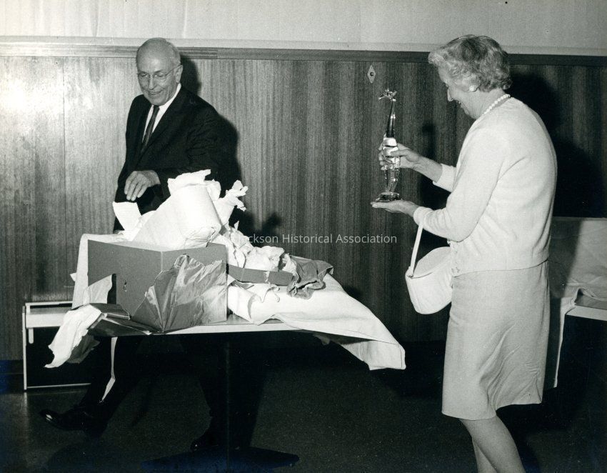 Mr. and Mrs. Griswold admiring a gift given at Nelson Griswold's retirement party on May 13, 1966 at the Dow Plant B Cafeteria in Freeport, Texas.Collection