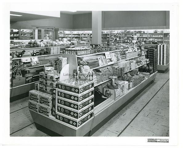 A black and white photograph of the aisles inside Lake Drug. In the foreground of the photograph are aisles of toys and games. In the background are shelves of various drugstore items and products. The photograph has a white border and stamped on the white border in the bottom right corner is "Woodallen Industrial Photographers Houston". Stamped on the back of the photograph is "Woodallen/ Industrial Photographers/ 3505 Louisiana Phone JUstin 4698/ Houston 6, Texas/ Neg. No. GK41-1". Next to the name of the photographer is the logo for the Professional Photographers Guild of Houston.Collection