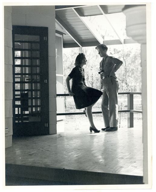 Photograph of a young woman and soldier on the breezeway deck of one of the first buildings designed and built by Alden Dow, located at 101 South Parking Place in Lake Jackson. The back of the photo is dated October 1943 with the names Miss Wagstaff and Mr. Gilbert.Collection