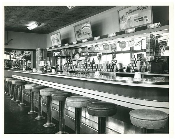 Black and White photo of the front of Lake Dug's fountain area. At the counter is a row of stools, and on top of the counter to the left is a pie case. Behind the counter, along the back wall, is a mirror and a small counter with the cash register to the right and stacks of cans to the left of the register.Collection