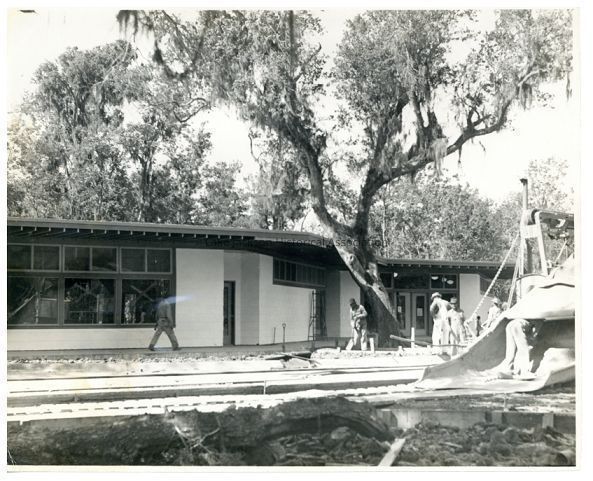1- Black and white photograph of early construction in front of Lake Drug. The workers are preparing to pave the street and parking lot in front of Lake Drug. The machine to the right is a street paver.Collection