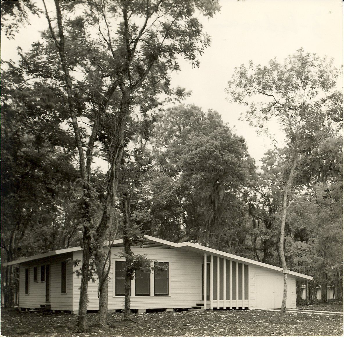 A three bedroom home designed by Alden Dow in early Lake Jackson. Home includes screened in porch, one bath, kitchen, one car garage, and is shown on concrete blocks. Photo is black and white. In the upper left and right corners are small holes where the photograph was pinned to a wall. Written on the back at the top is "3-bedroom house family" and written in the center is "Astleford".Collection