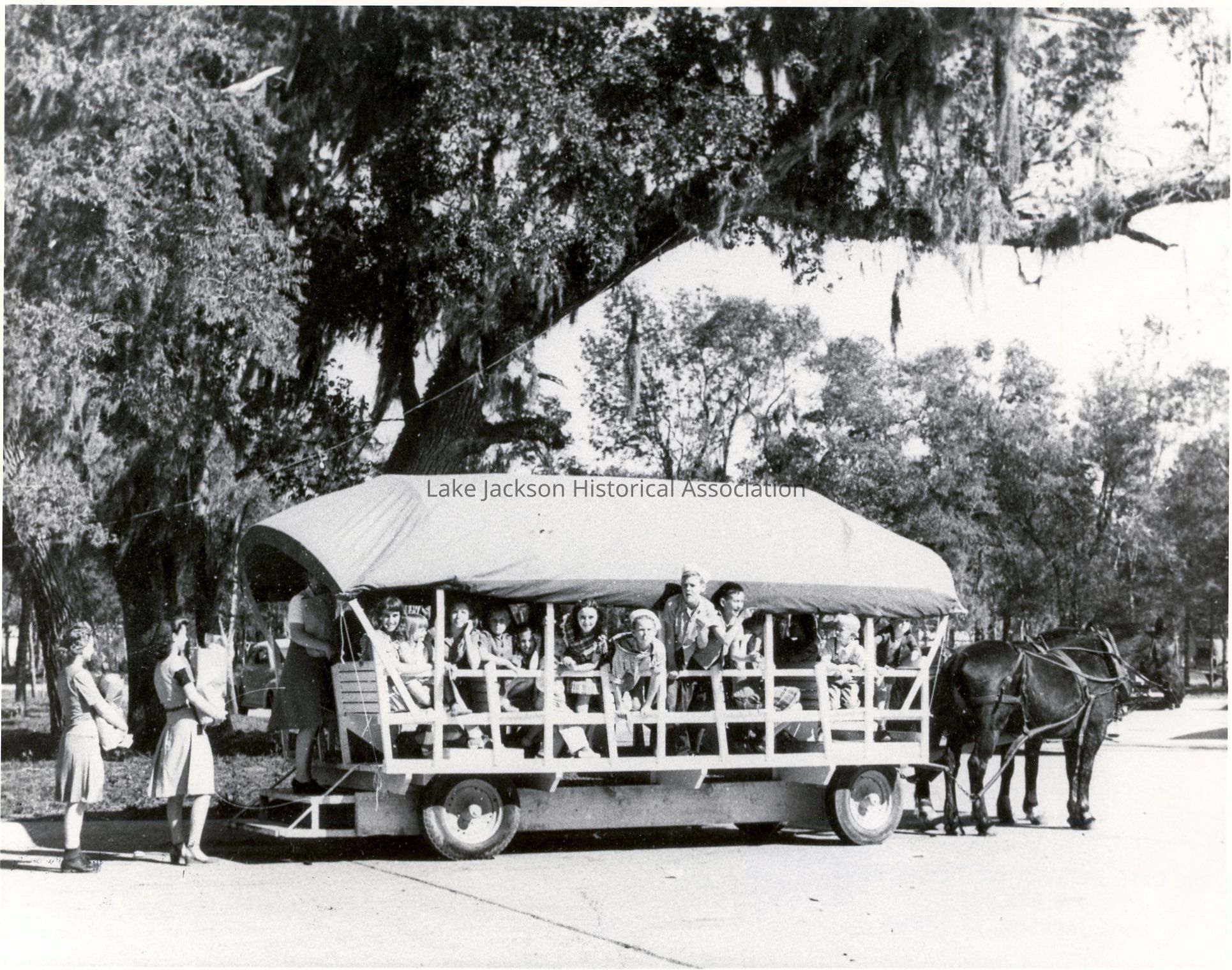 One black and white photo of the first stage coach in Lake Jackson. Children are leaning out from under the stagecoach's roof while ladies with shopping bags are preparing to board the back of the stagecoach. Second woman from the left, holding groceries, is Gertrude "Dement" Farrar. Two black horses are harnessed to the front of the stagecoach.Collection
