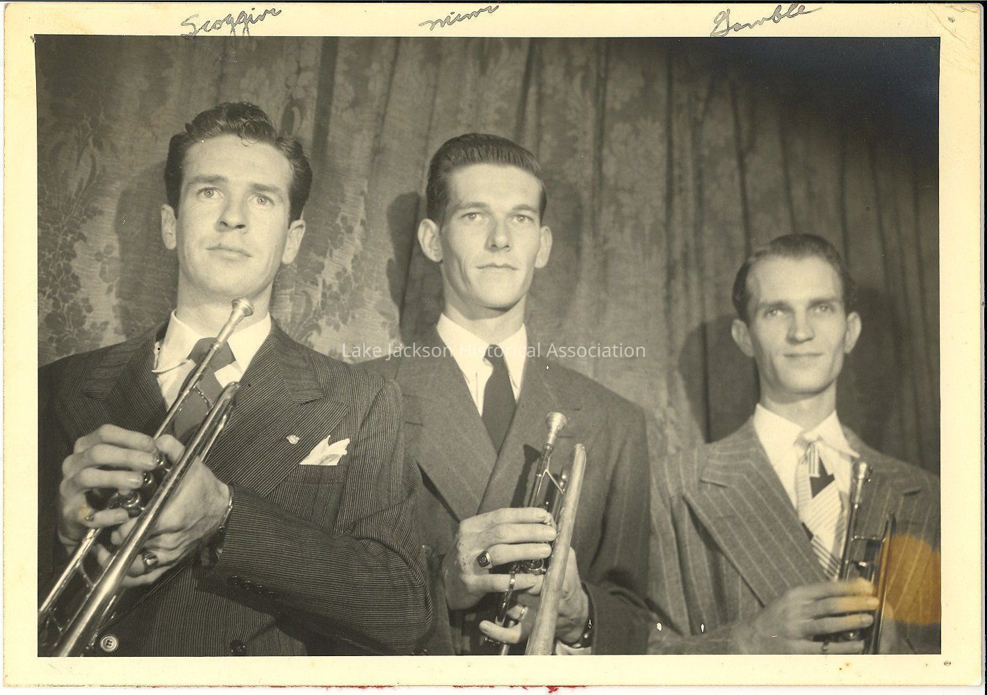 Black and white photo of members of the band including cornet players Grant Scoggins, Mims, and Stan Gamble, taken at a concert.Collection