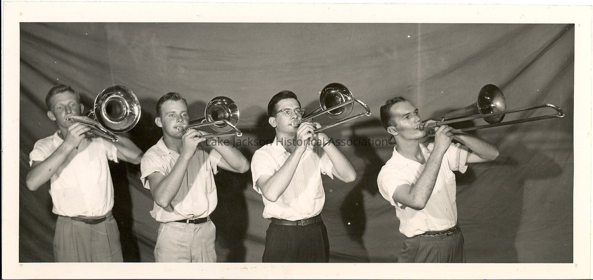Black and White photo of four trombone players taken on August 7, 1952. Included in the picture are Bill McCutcheon and Byne Baker.Collection