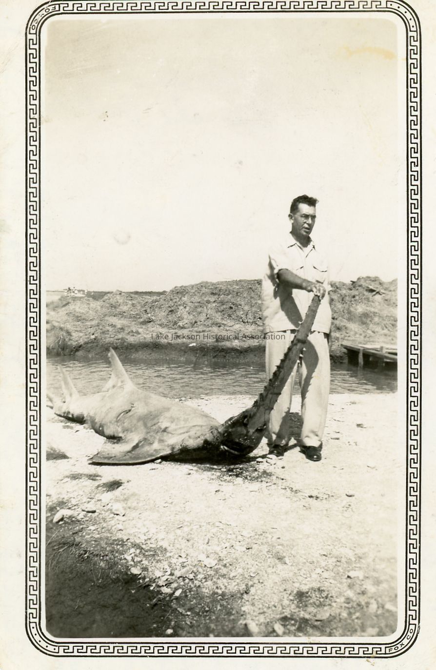 Black & white photo of Carl Schreiber with sawfish caught at drawbridge over Intercoastal Canal at Surfside in July, 1943.Collection