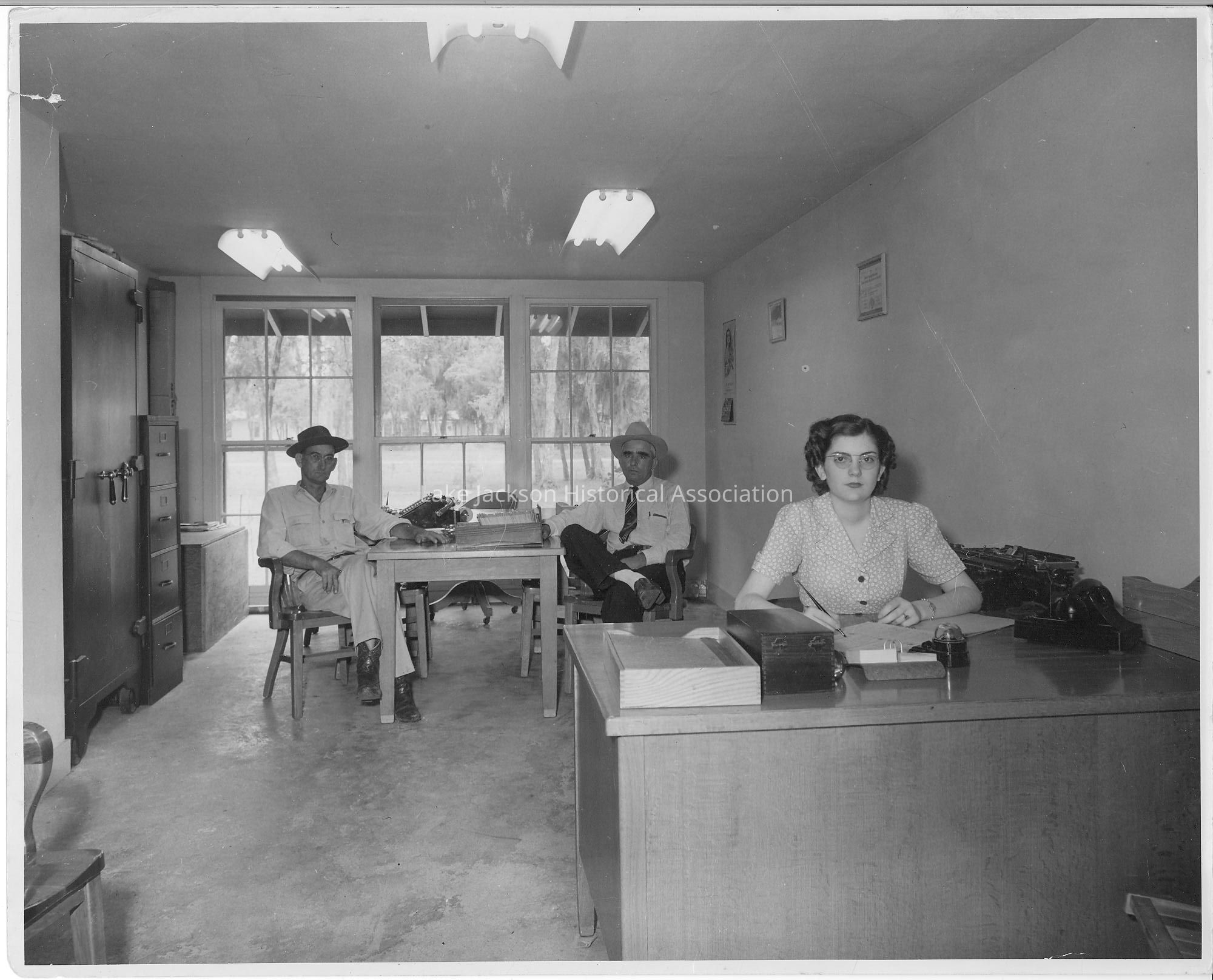 Black and white photo of City Hall in Lake Jackson in 1944. City Hall was located in Carriage Square. Photo includes Mary Alice Elbert, Captain J. S. Brown, and R. E. Barrow.Collection