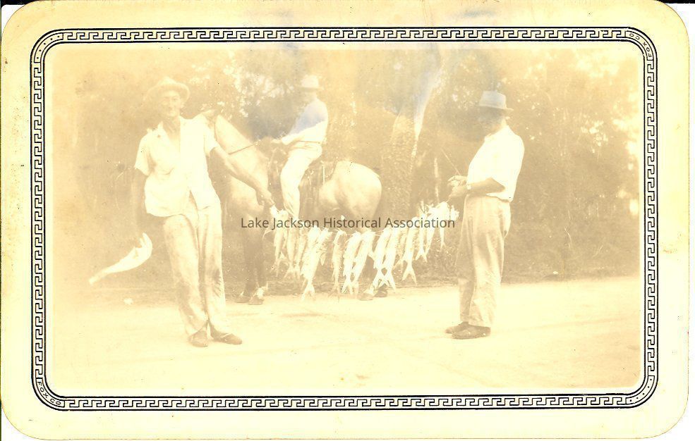 Black and white photo of Captain Brown on horse with Earl Barrow at left and Carl Schreiber at right with a fish catch.Collection