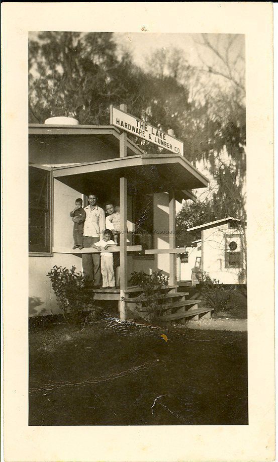 Black and white photo of the old Lake Hardware and Lumber Company in Lake Jackson. Photo has family showing on front porch.Collection