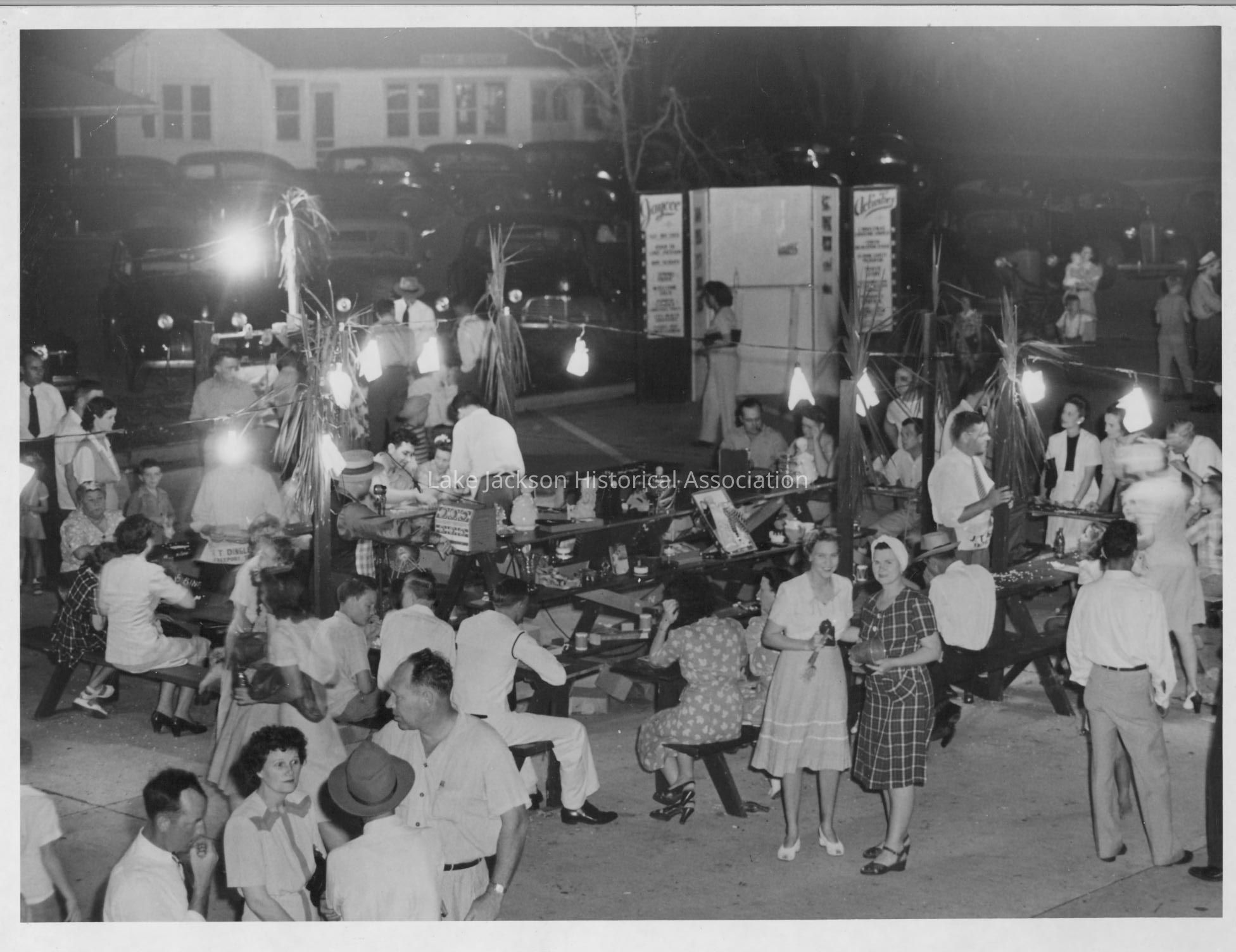 Black and white photo of a carnival sponsored by Lake Jackson Jaycees. Photo is a street scene with lots of people. Bingo table is shown in photo. There are two ladies looking directly at camera in the center of the photo. The young lady on the left is Peggy Kirtley (Moore) and her mother on the right was Maude Elizabeth Kirtley.Collection