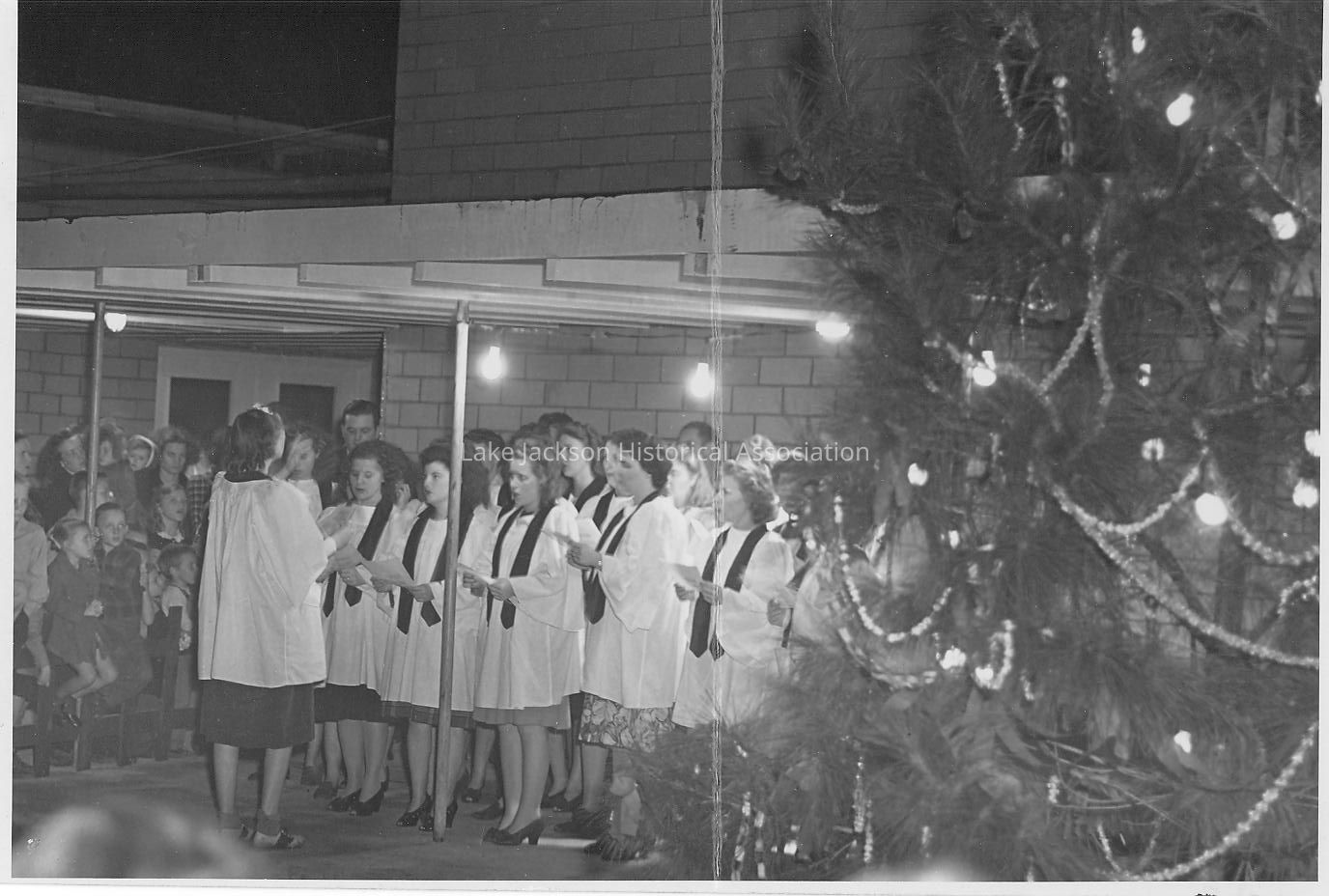 Black and white photo of the combined choirs of the Baptist and Methodist Churches for a city Christmas celebration sponsored by the Lake Jackson Jaycees Dec. 1944.Collection