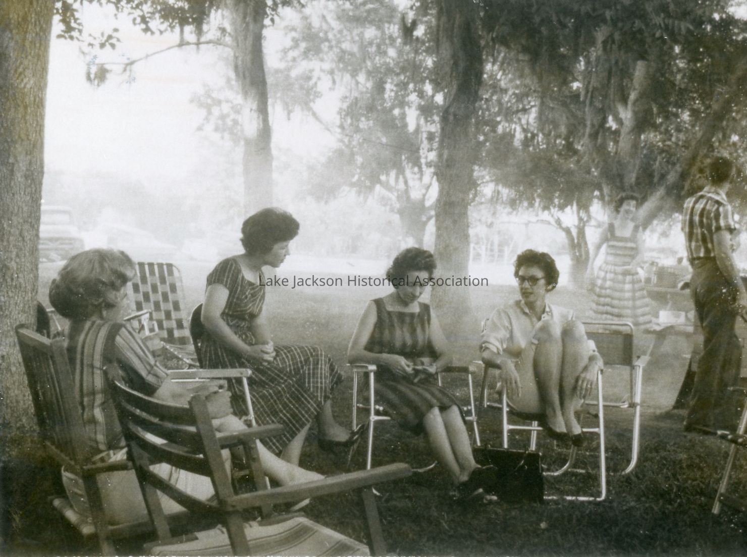 Black and white photo of early Lake Jackson residents at picnic and BBQ.