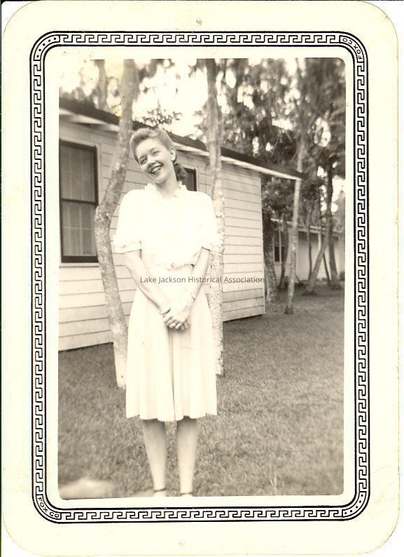 Black and white photo of Evelyn Plummer Anderson. Evelyn married Paul Anderson, uncle of Paul Anderson (photo 1984.47.2). Believed to be the first couple in Lake Jackson . Married 1944 by Rev. Chester Steele in the home of H. Orville Anderson at 133 Center Way.Collection
