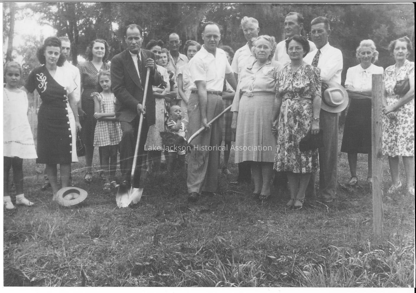 A black and white photo of The First Baptist Church groundbreaking at the corner of Yaupon and Winding Way in Lake Jackson in 1945.