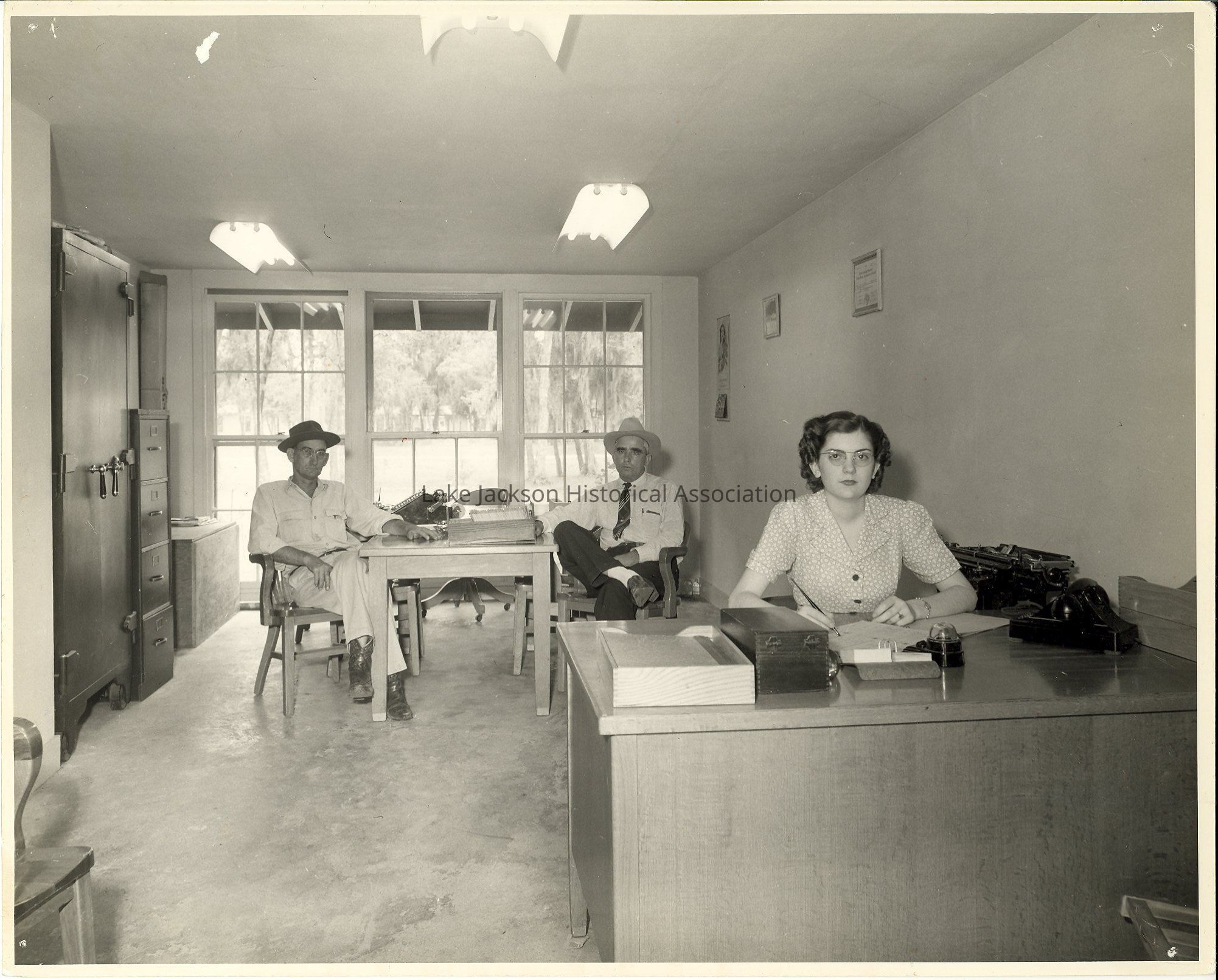 A black and white photo of R. E. Barrow, J. S. Brown, and Mrs. Jimmy Grant in office scene.Collection