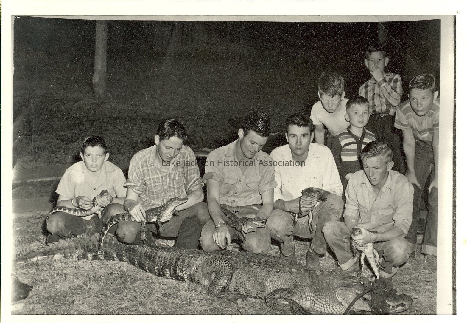 A black and white photo of alligator and babies caught in Lake Jackson. Five teenage boys are holding the baby alligators as they are kneeling behind the adult alligator. Four younger boys are gathered around the teenagers.