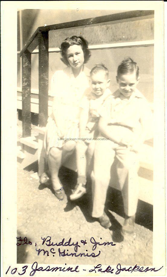 A black and white photo of Flo, Buddy, and Jim McGinnis, all sitting on a porch. Buddy died in 1984 or 1985. At the bottom of the photograph, written in black ink, is "Flo, Buddy & Jim McGinnis/ 103 Jasmine- Lake Jackson".Collection