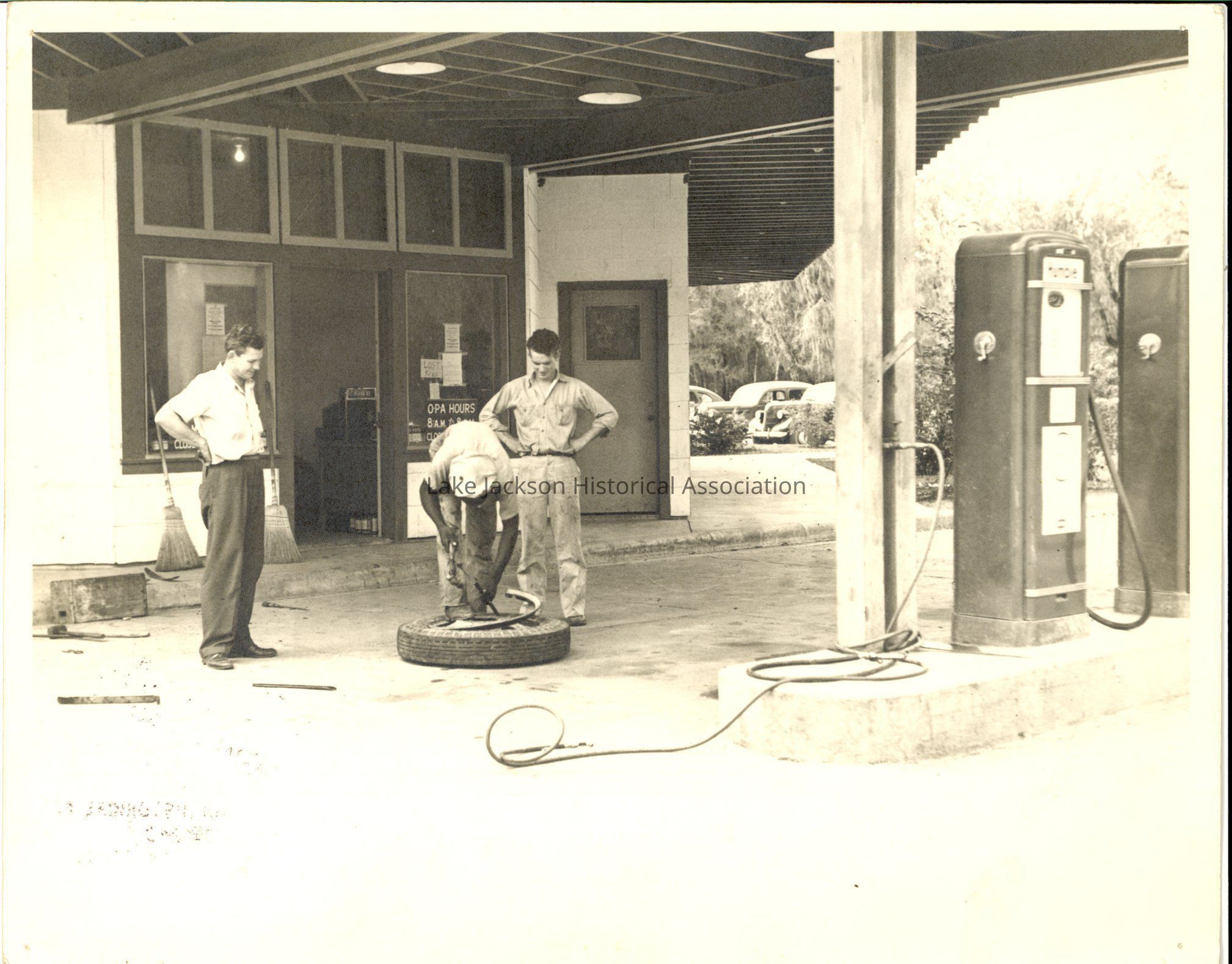 A black and white photo of Burley Schmidt's service station in October 1943.Collection