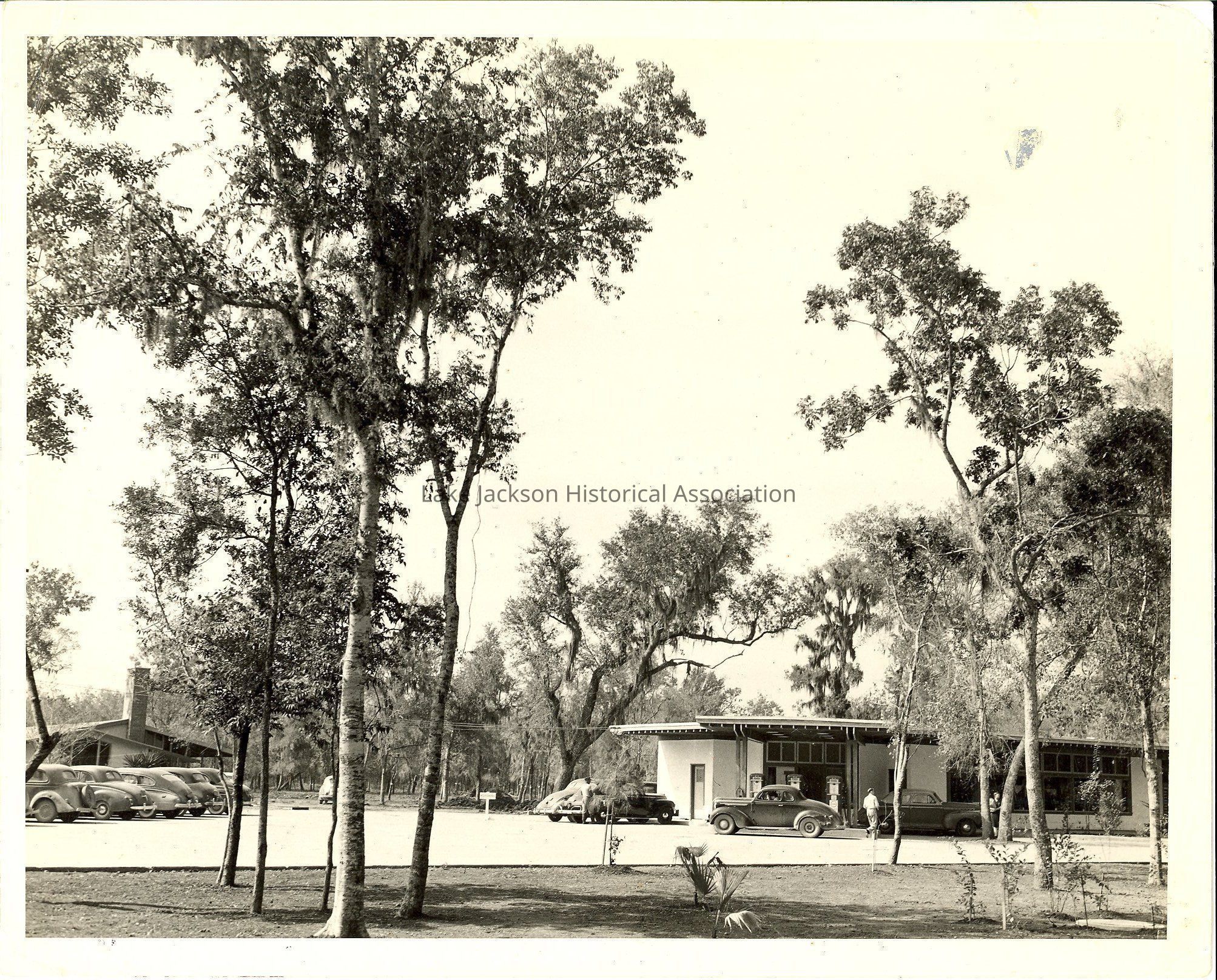 A black and white photo of view of Alden Dow's office and Schmidt's Service Station.Collection