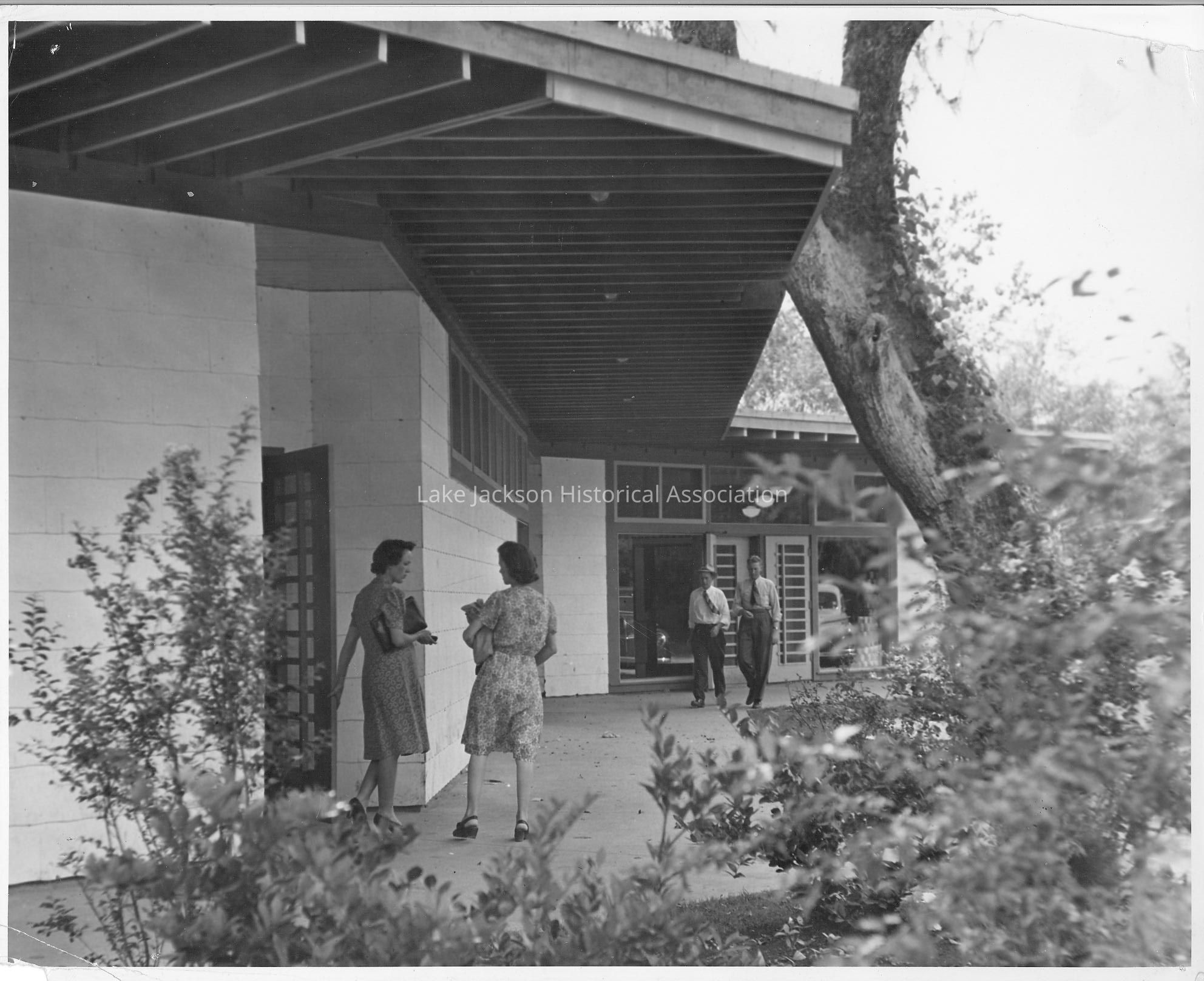 A black and white photo of the exterior of the Lake Drug on left and Piggly Wiggly on right.Collection