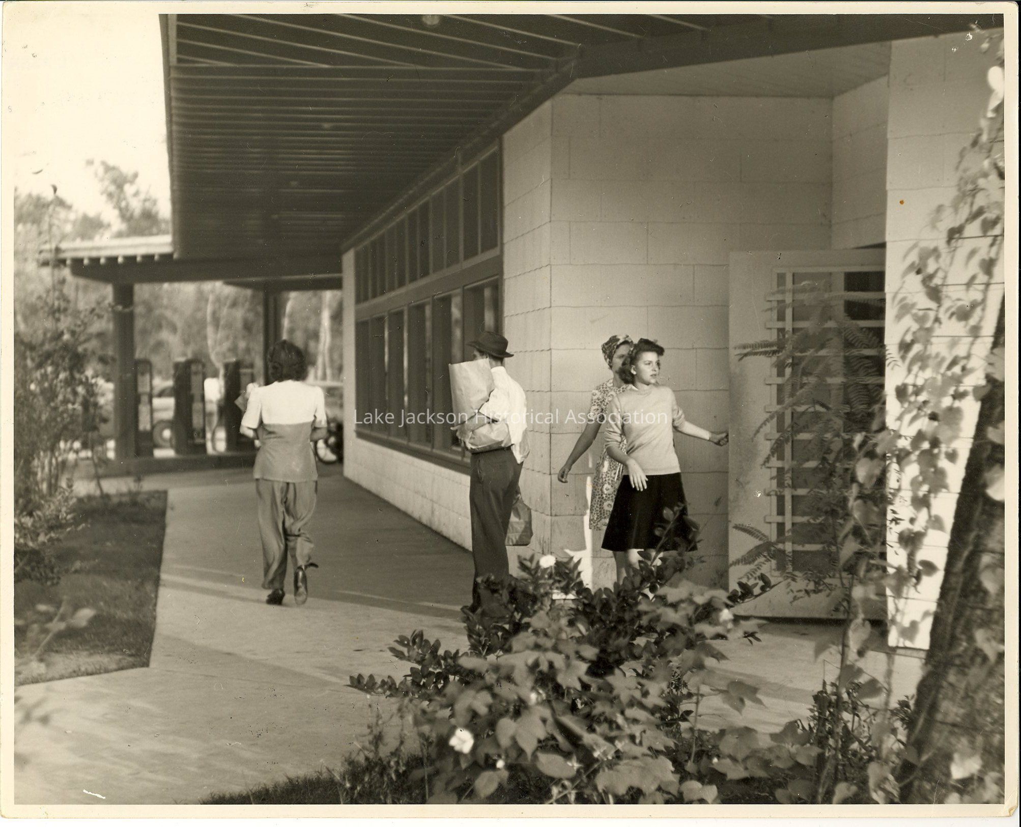 A black and white photo of the front door and exterior of Lake Drug and Schmidt's Service Station.Collection
