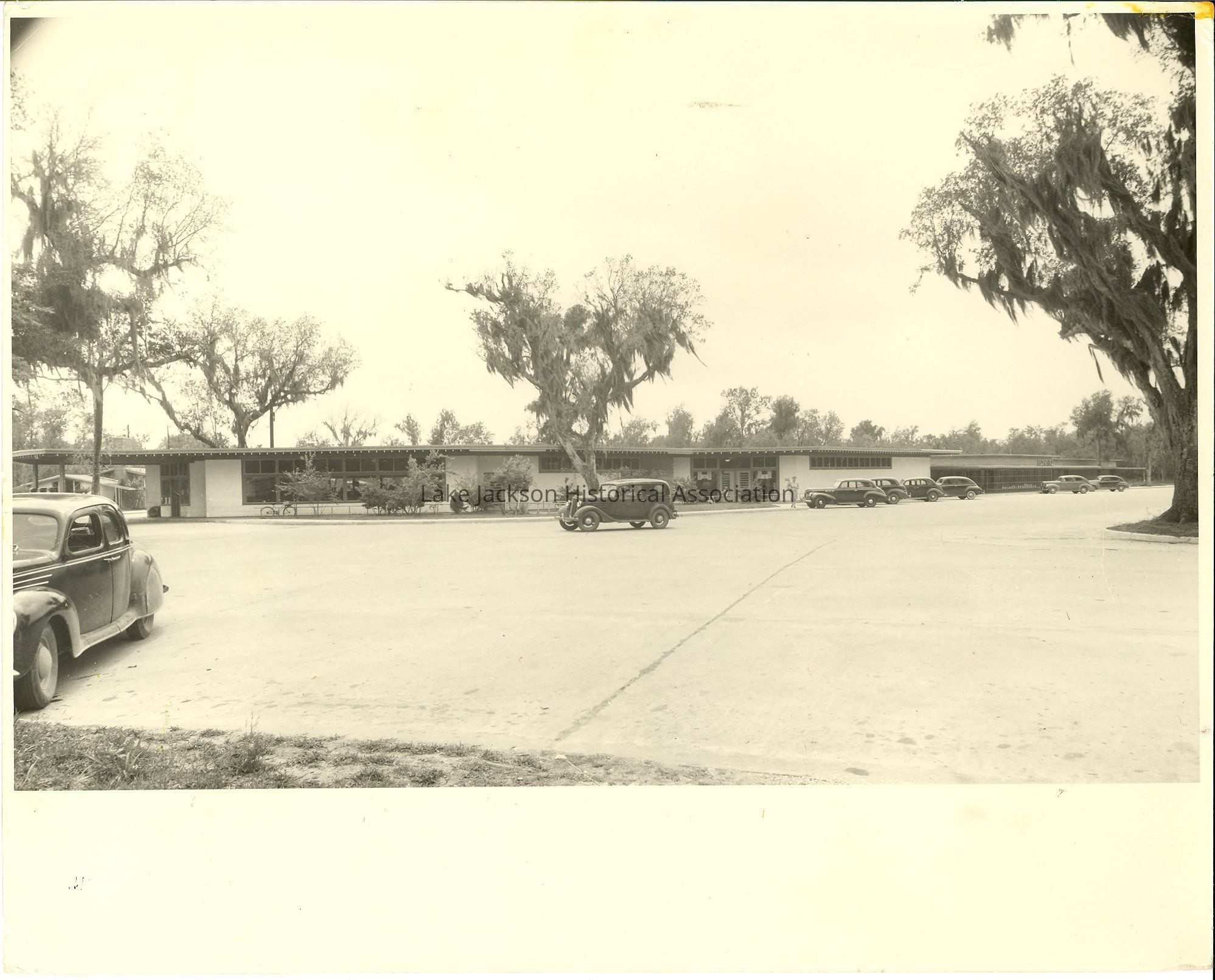 A black and white photo of wide view of Schmidt's Service Station to the end of the block. Includes Lake Drug and Piggly Wiggly.Collection