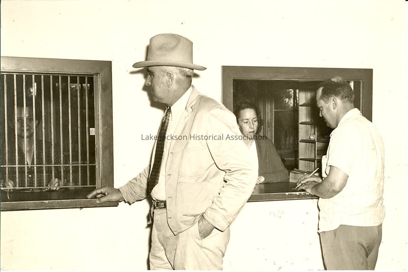 A photo of post office with Cap Brown and Annette Greer behind the security window.Collection