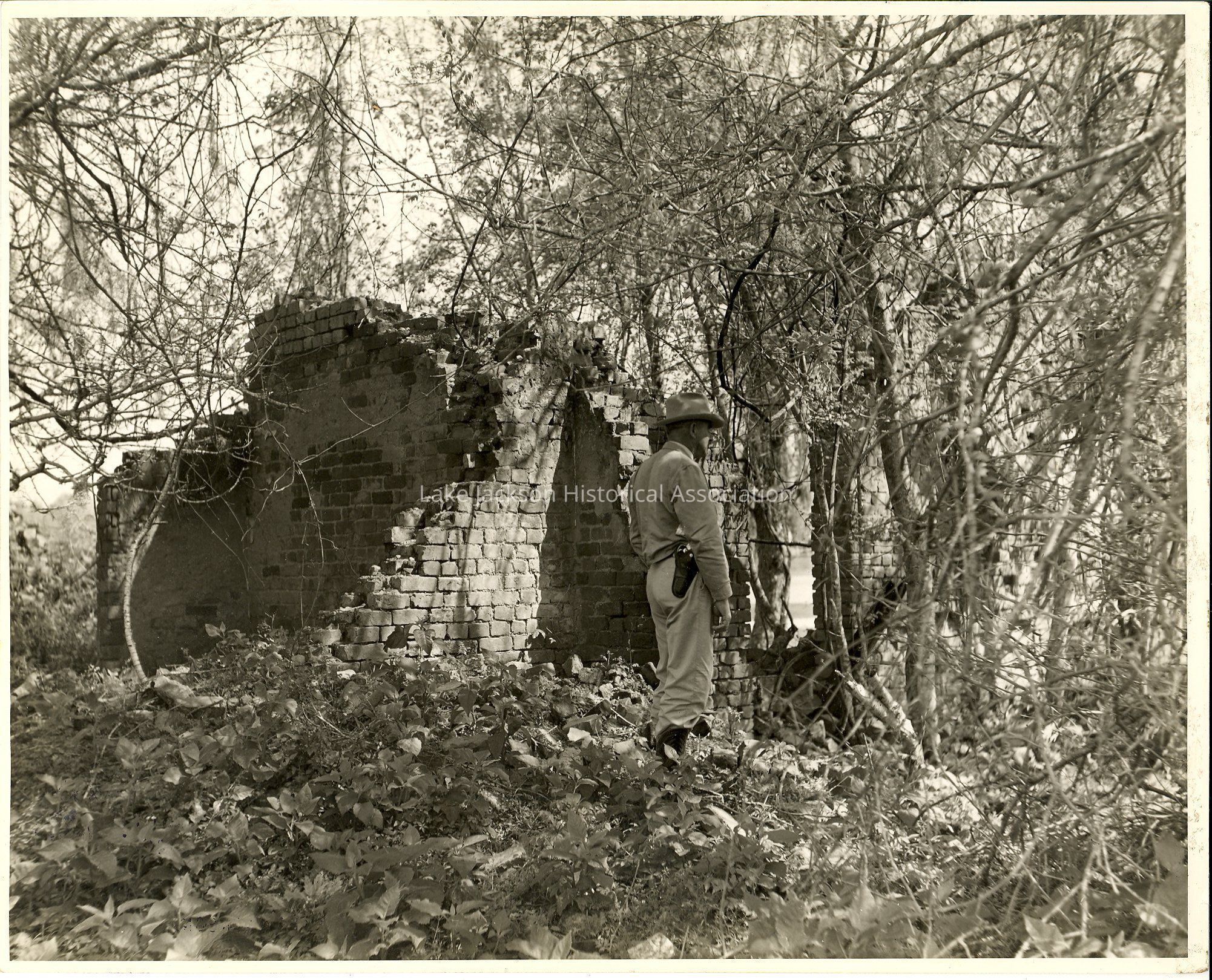 A black and white photo of Captain Brown in the Lake Jackson Plantation ruins.Collection
