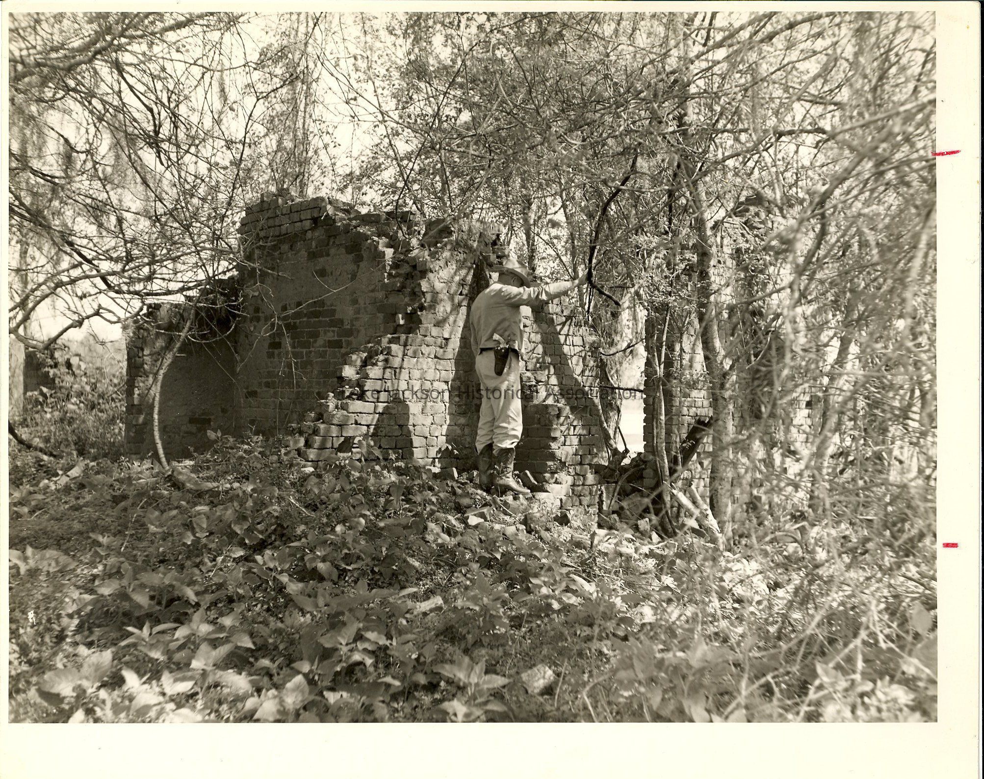A black and white photo of Captain Brown standing in front of the Lake Jackson Plantation house ruins.Collection