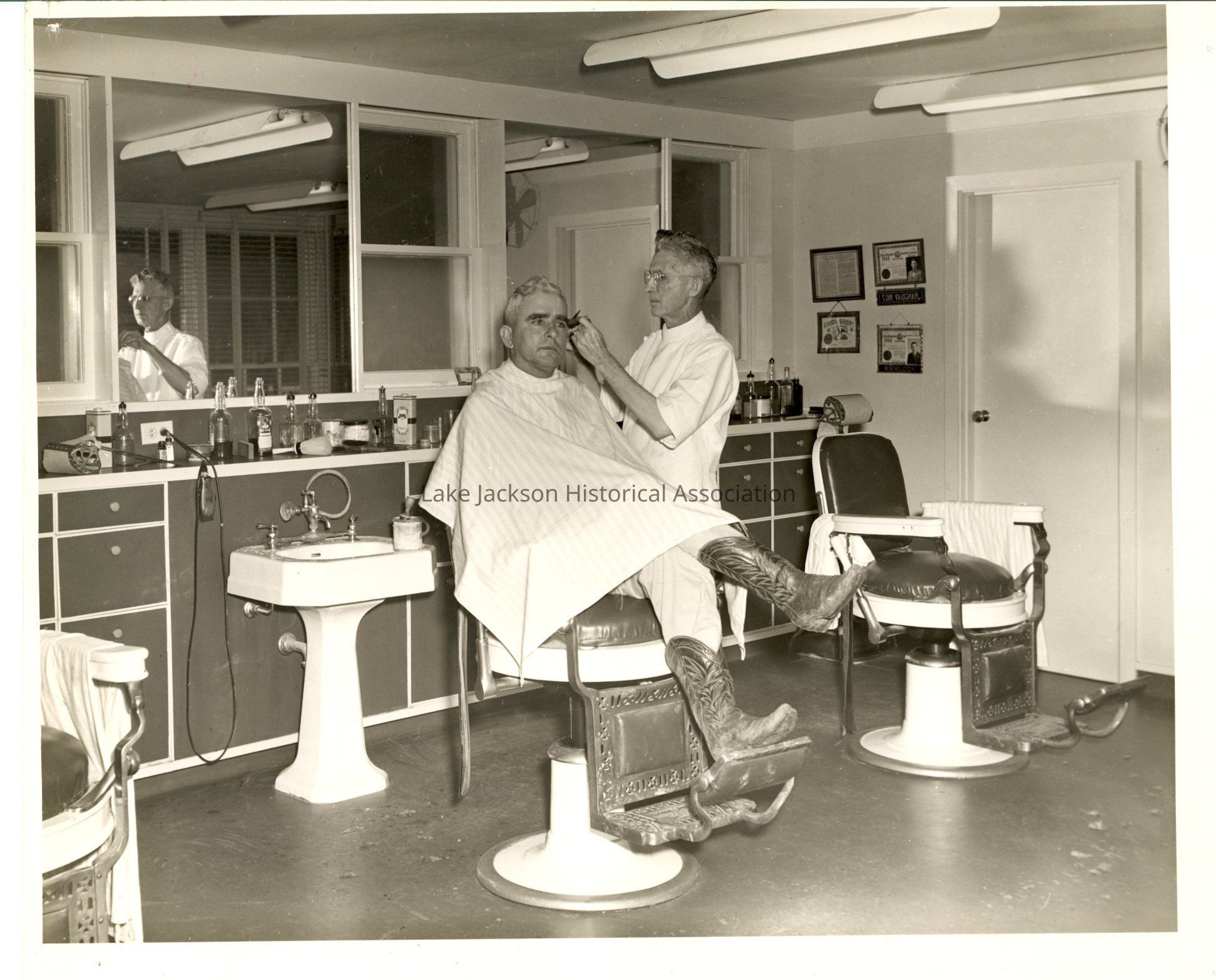 A photo of Captain Brown getting a haircut from Tom Vaughan.
